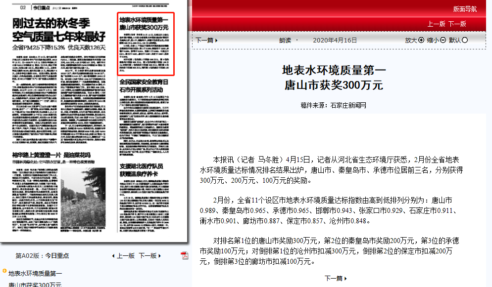 获悉,2月份全省地表水环境质量达标情况排名结果出炉,唐山市、秦皇岛市、承德市位居前三名,分别获得300万元、200万元、100万元的奖励。