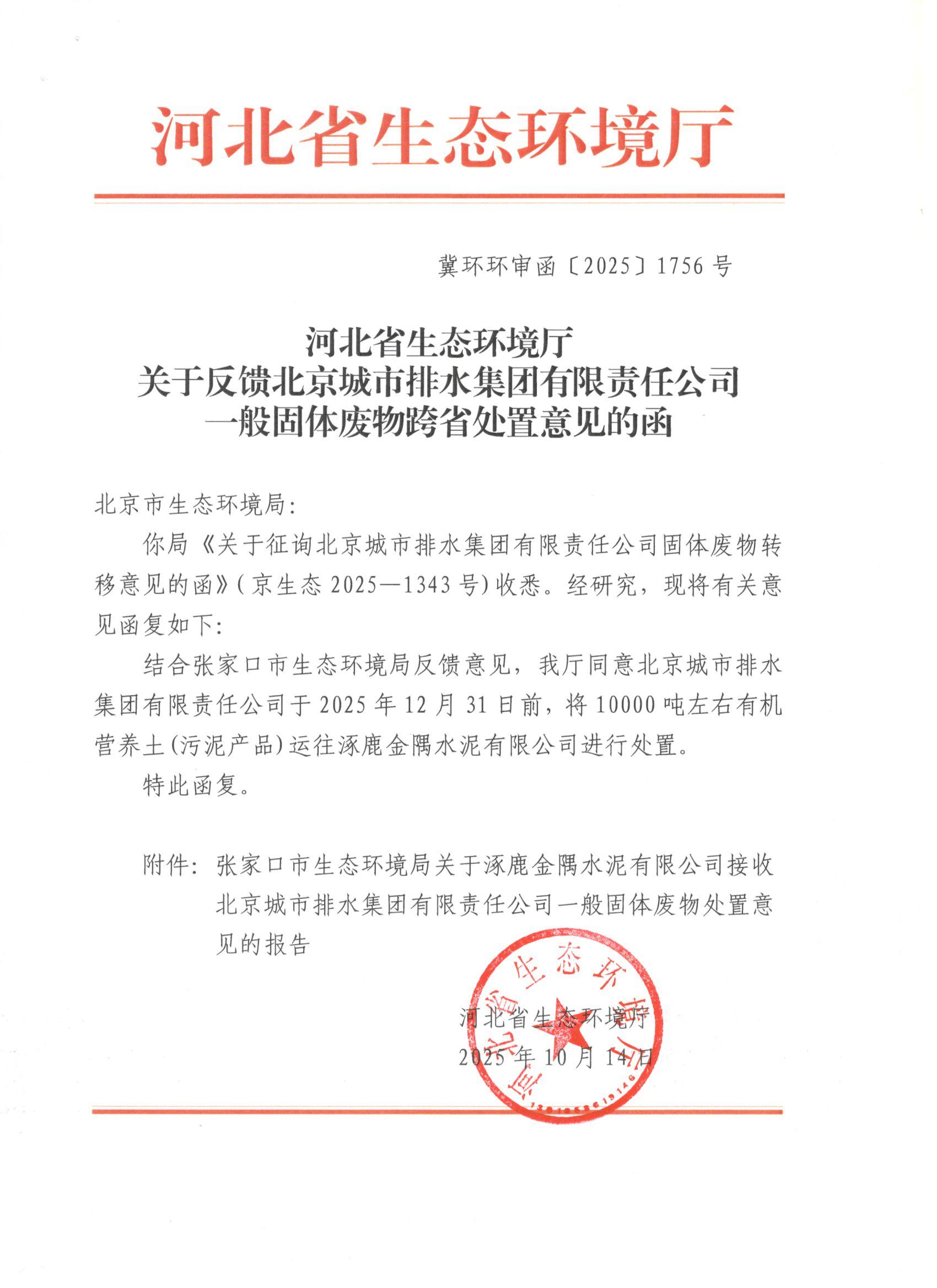 关于反馈北京城市排水集团有限责任公司一般固体废物跨省处置意见的函