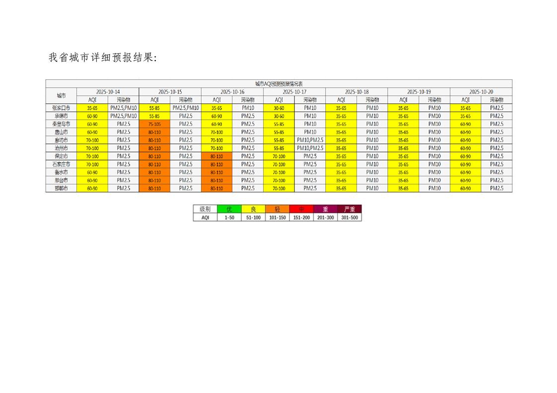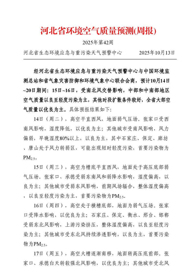 河北省空气质量预测报告周报2025年第42周