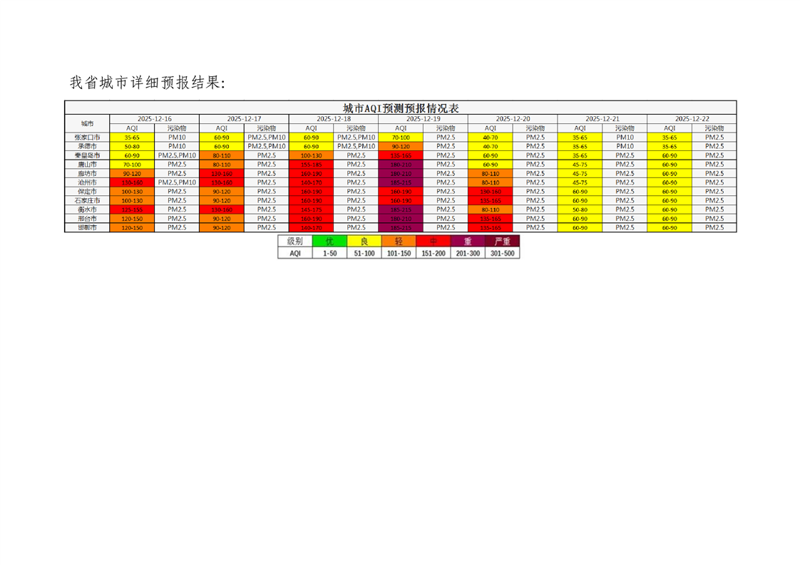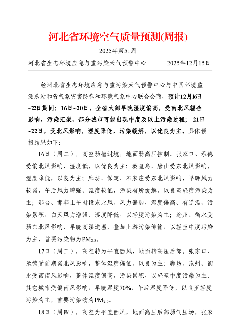 河北省空气质量预测报告周报2025年第51周