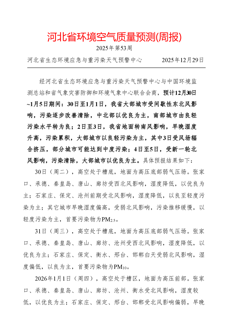 河北省空气质量预测报告周报2025年第53周